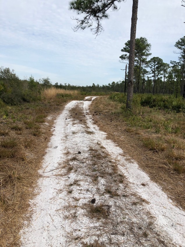 After fording a couple of streams and fighting with some very thick over and undergrowth we finally found what we believed to be some white blazes. But these led us back to a white sand road. We walked along it and then saw blazes on a tree way across another field of saw palmettos. But as the trail, according to the directions, was going to rejoin the sandy road we thought were on, we decided not to bother with that particular scenic overlook and to stay on the road for a bit. Turned out the road wasn’t any easier walking as you sank several inches into the sand with each step.