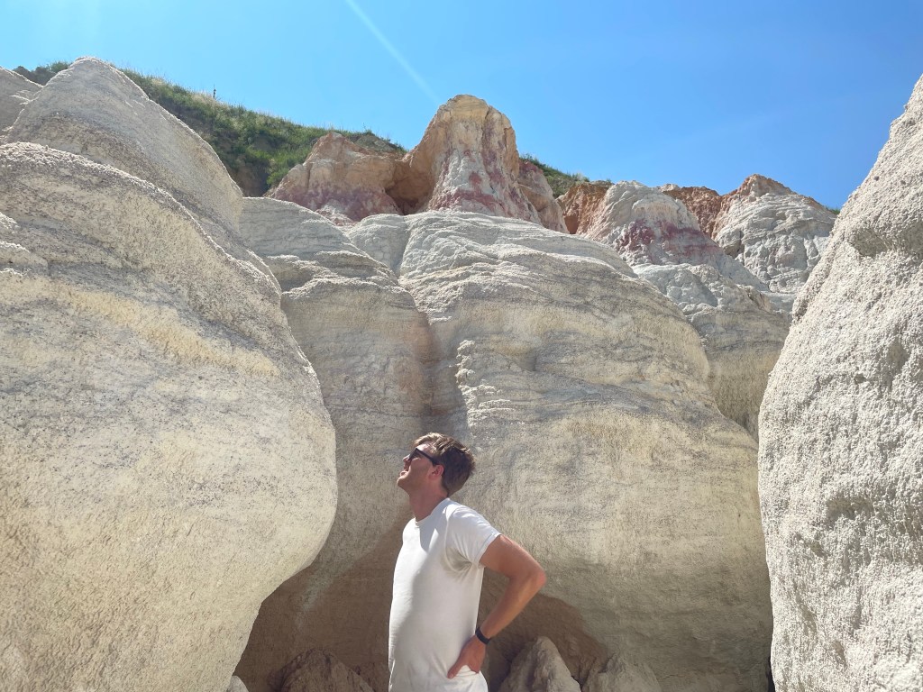 We finally turned off onto a dirt road and reached the Painted Mines. Other than a few signs, a restroom, and trails, there was nothing official. At first it seemed quite anticlimactic and hardly worth the drive. But once we passed the white sandstone outcroppings, we turned a corner and walked up a hill where we could see white smooth caverns and passages, with orange, pink, lavender spires above. Remarkable. If you weren’t impressed by the scenery, just learning the word “hoodoo” – a fanciful stone outcropping – was enough.