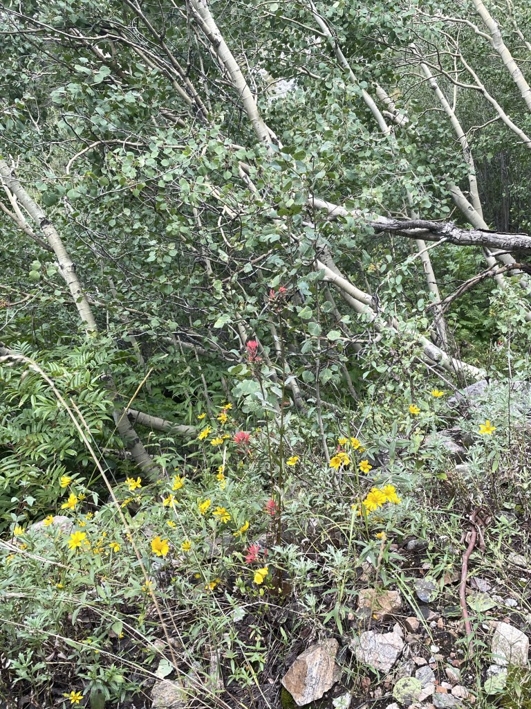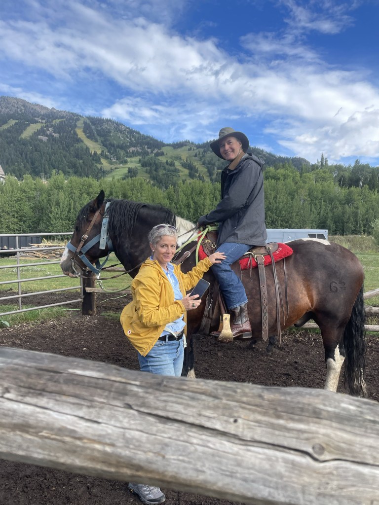 We met up with our niece, F (who really does live near Nice, France), as she was the only of our family group willing to brave the large four legged creatures that were to take us up one of the nearby mountains. She rode a very hungry “Chuckles,” J had a chunky “OT” (for Overtime), and I was blessed with Rhinestone. Apparently the trail company has over a thousand horses between Grand Teton National Park and one other location. Beautiful wildflowers, including lots of Indian Paintbrush, which is the Wyoming state flower. My favorite part was when our guide instructed us to get a move on so our horses weren’t spooked by the nearby bear cub who had climbed a tree, with Mama Bear right below.