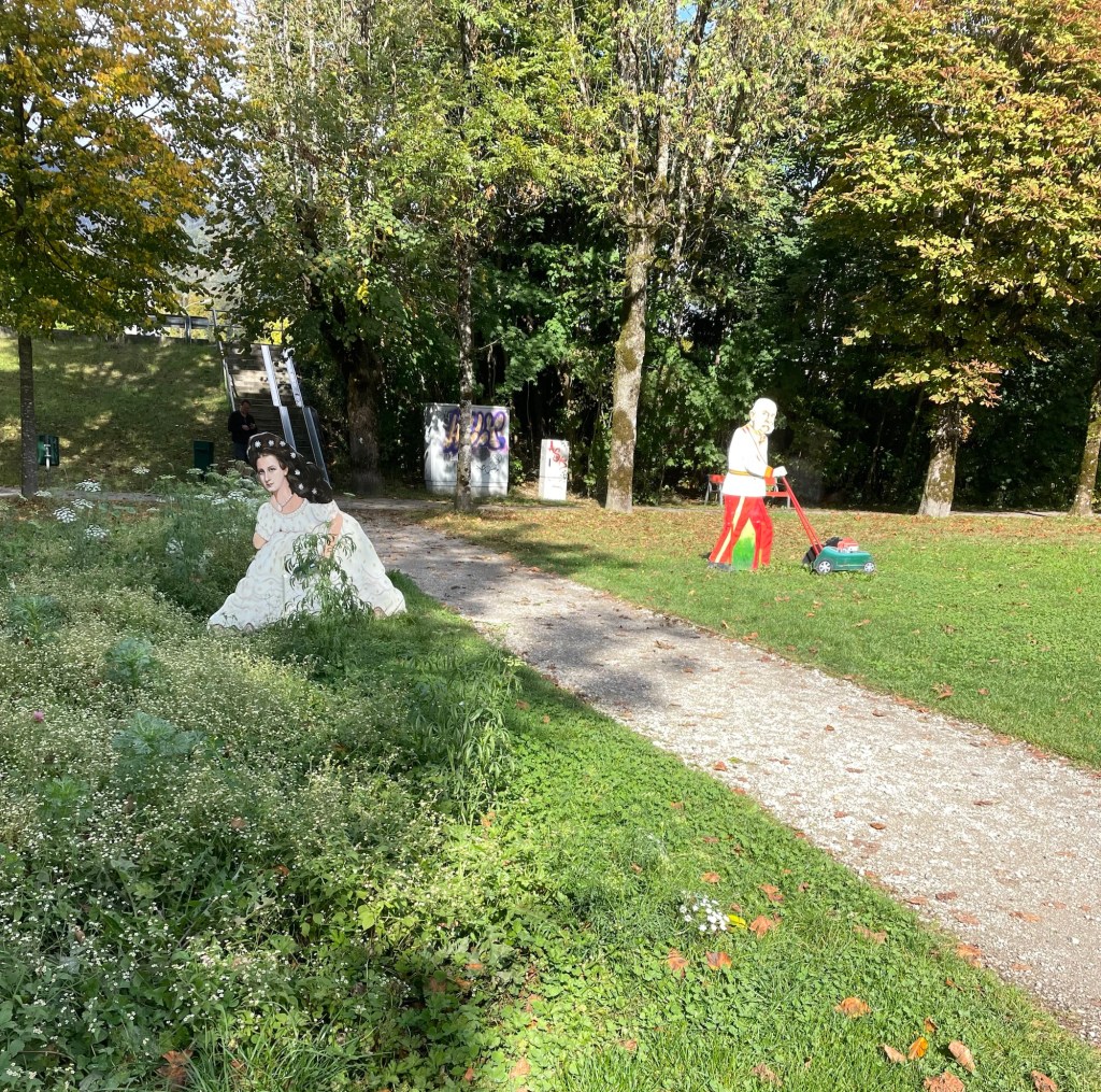 We decided against a visit to Kaiservilla, the summer residence of Emperor Franz Joseph I, and Empress Elisabeth of Austria (known as Sisi). It was very expensive and we only had an hour before closing, so instead we chose to have a drink at an open air cafe (under the awning, while it rained around us), and enjoy window shopping (especially the modern takes on traditional Austrian dress). We also spent time in Sisi Park. Bad Ischl pays homage to her (and her husband) in many ways (for example, cartoonish metal sculptures of them gardening in the park…).