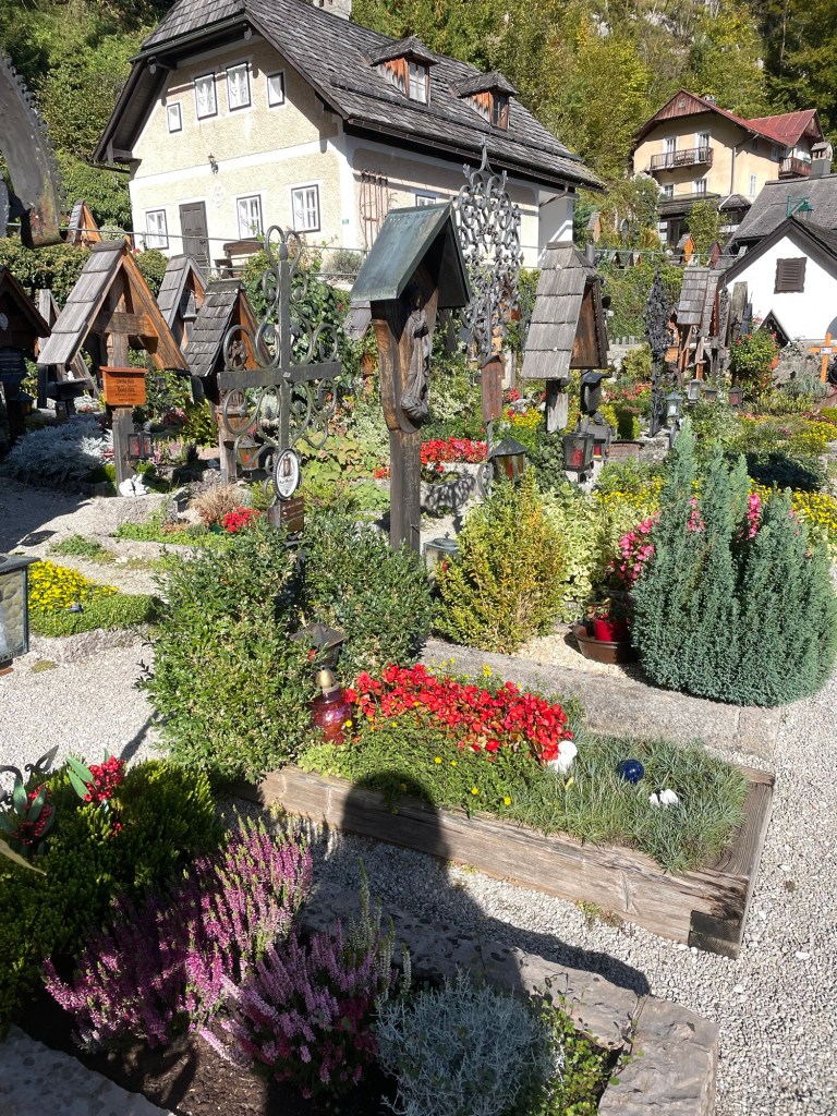 The town, built on the side of a cliff, is spectacular and filled with flowers. Salt mining was its claim to fame. The 19th century Lutheran church (first non-Catholic church I’ve seen ) by the dock has a large poster explaining that’s where the unfortunate Protestants were sent during the Counter Reformation. The Catholic Church is high up on the hill, surrounded by a cemetery, each grave with its own flower plot.