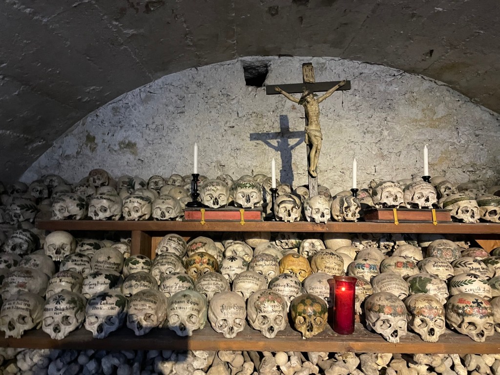 But Hallstatt is best known for the Charnel House. We saw the entrance by the cemetery and decided to pay the 2 euros to go in, little knowing that we were about to walk into an ossuary for skulls. When the graveyard became too congested, the families brought the skulls into the ossuary. (Not sure what happened to the rest of the remains.) But rather than just plop the skulls down, they were painted with family crests, dates, and remembrances. I actually found it surprisingly peaceful. J, on the other hand, found it quite creepy.