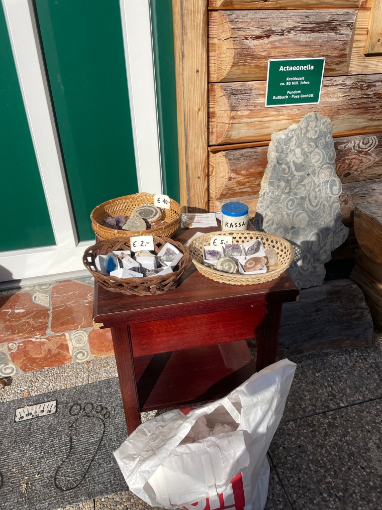 Eventually, we left the lakeshore to walk along the banks of the River Traun, which feeds into the lake. My favorite bit was the tiny village of Undersee. There, along the street in front of someone’s house, was a table of gems and fossils for sale on the honor system. I bought a beautiful ammonite for five euros.