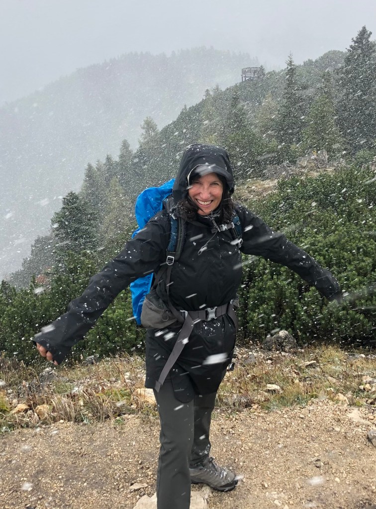 It was very cloudy, misty, and the “hut” where we’d hoped to have lunch was closed (as was most everything on Sunday). We took off up the mountain to the Katrinkogel, with only a few others hikers around. Tall evergreens gave way to short ones – and then it started to hail (small round pellets), shortly turning into genuine snow. It was very arid, dry and felt much better than rain. While this wasn’t a hard trail, there were certainly lots of steps.