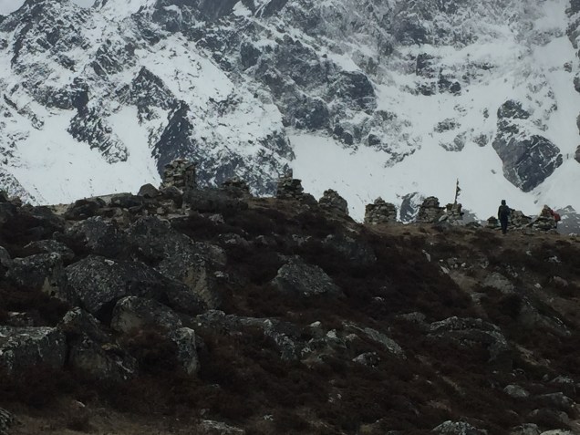 A lot of places welcome you with a stupa. From the air it appears as a mandala. Generally, three terraces at the bottom represent the foundation of meditation. The dome is the womb of emptiness from which all comes. The box on top is painted with the eyes of the guardian Buddha. Some stupas, instead, have a statue of the Buddha in a glass enclosed niche. The 13 steps above represent the 10 levels of compassion and the 3 levels of tantric awareness. The umbrella is the sovereign sanctity of the Buddha mind and the crowning jewel in the top its wish fulfilling capacity. Buddhism is woven in to the fabric of everyday life here. On the return part of our trek I saw an old man sitting outside his tea house, running his fingers along his mala (a rosary of 108 beads) while spinning a handheld prayer wheel. His wife sat next to him, wearing the traditional long skirt with a woven apron on top, while their dog slept in the sun – all with the majestic mountains towering in the background.