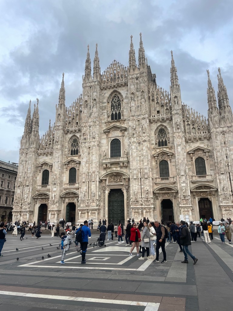After we had settled in, we walked to the Duomo. It is magnificent- over the top Gothic architecture- but it is self funded and according to our tour guide, not supported by the Vatican. To raise money they project ads on the backside of the building itself. It’s a bit disconcerting. We also strolled through the 19th century galleria – anchored by a huge crystal dome and home to the original Prada.