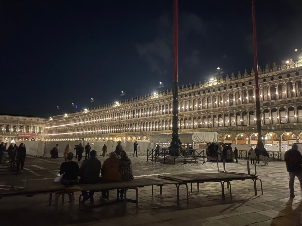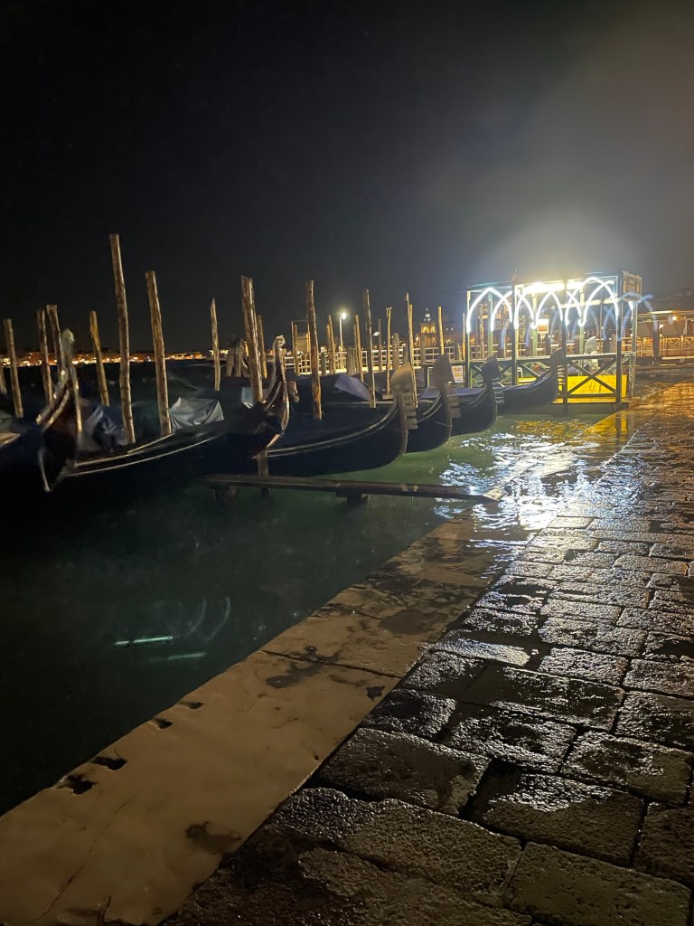 Afterwards, we walked to the beautifully illuminated Piazza San Marco and one of its famous cafes (Quadri), home of one of the “dueling orchestras.” We paid way too much for fabulous martinis but they were accompanied by all sorts of snacks – olives, nuts, peanuts in the shell, crackers, and tortilla chips. Plus the music was very fun, especially the rendition of the James Bond theme music – and people really did dance in the square. The illuminated balls that children were throwing into the air made the whole evening sparkle.