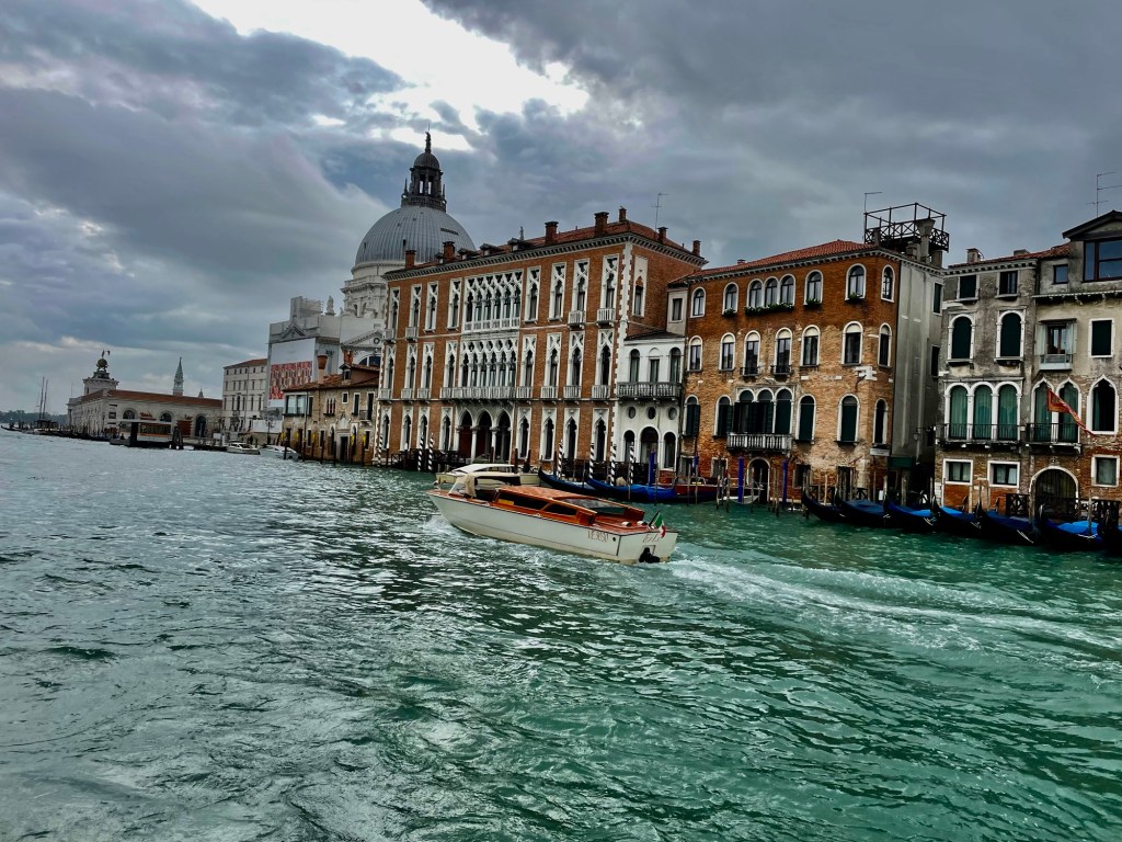Following our train ride(s) from Milan, we arrived at the Venice train station and managed to find our way to a very crowded vaporetto or “water bus.” Rather than the scenic one that travels the famous Grand Canal, we ended up on the 5.2 route – which goes through the wide part of the canals (or was it a harbor? Hard to tell what the bodies of water are). Our vaporetto took us past docks, ships, all forms of water craft – and finally deposited us at the San Marco/San Zaccaria stop. From there it was an easy walk to the B and B – it was up a narrow alley with one turn at the “mosaic of the doge” embedded on the pavement. Through a gate and up a flight of stairs and there we were greeted by a small guest house with modern furnishings, a nice breakfast, crisp sheets, and terrazzo floors. A distinct contrast to our digs in Milan.