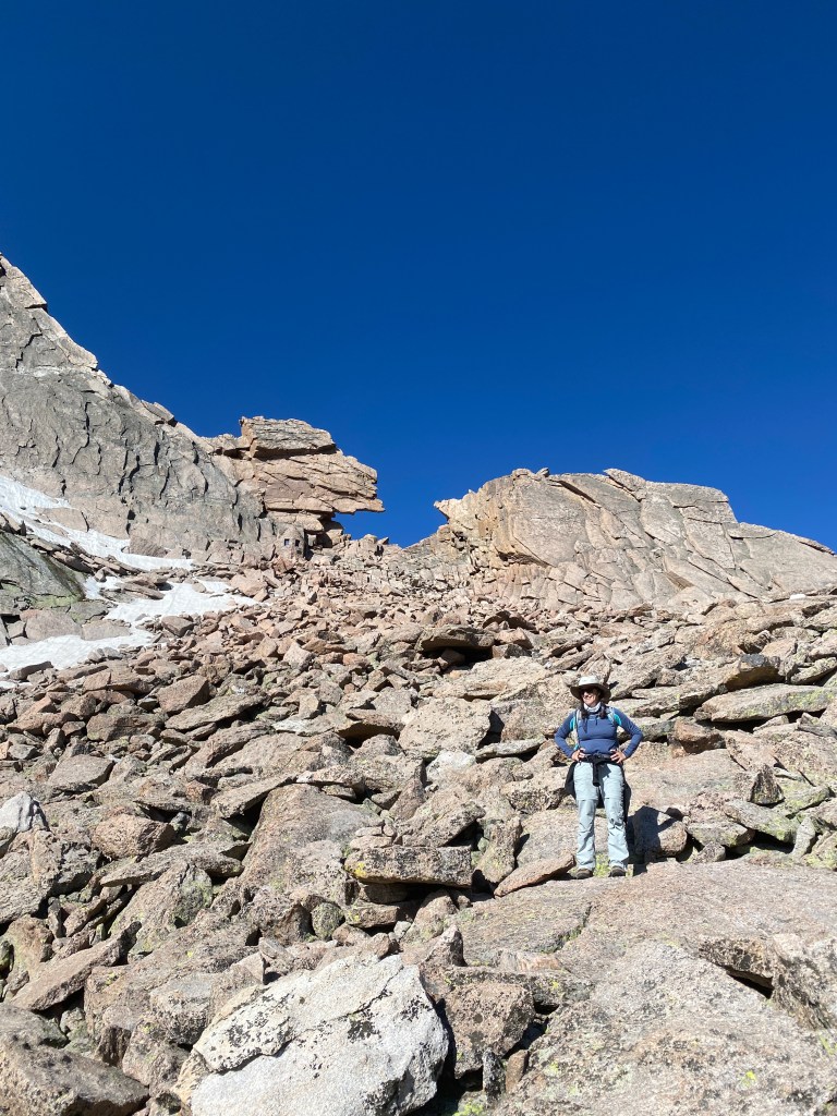 Once we packed up the tents and ourselves, we finally got on the “road”. We had another 4 plus miles to our next campsite, but at least the trajectory was downward, which certainly helped ease the weight of the packs. We climbed over and through lots of rock, and then emerged onto a broad expanse of rocky grasslands. We stopped for lunch where we were joined by another hiker we had met at the Boulderfield- he had gotten to about 100 feet below the summit but had to stop at that point because of ice. A number of large and well fed looking marmots also participated in our dining activities – or attempted to!