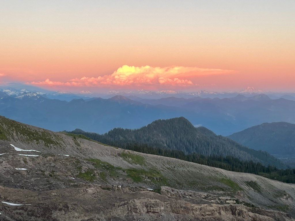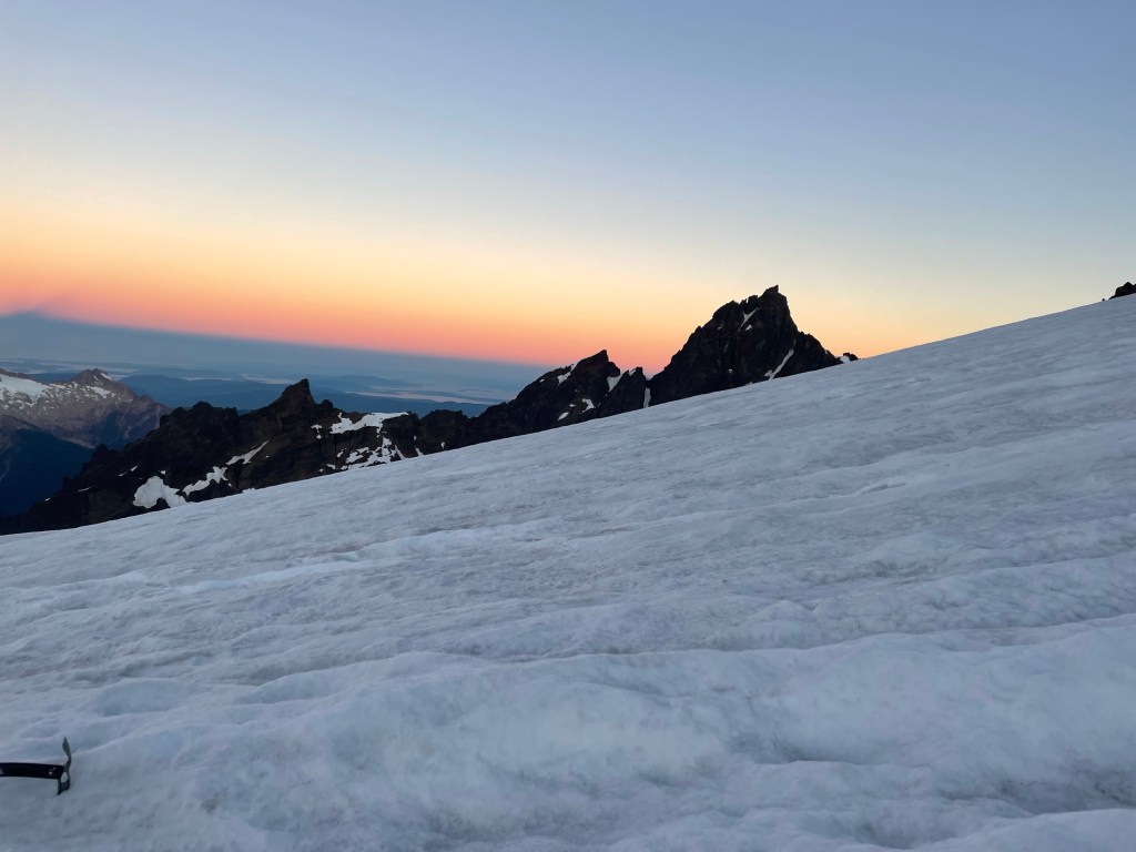 After we settled in, we had a dinner of Mac’n cheese and smoked salmon and hiked up to a nearby bluff to see a spectacular sunset. On one side are the majestic mountains of the Cascades, on the other, the glassy ocean with Vancouver Island in the background. The setting sun backlit the clouds and snow capped mountains turning everything a soft apricot. It was a good omen for the next day and our upcoming summit attempt.