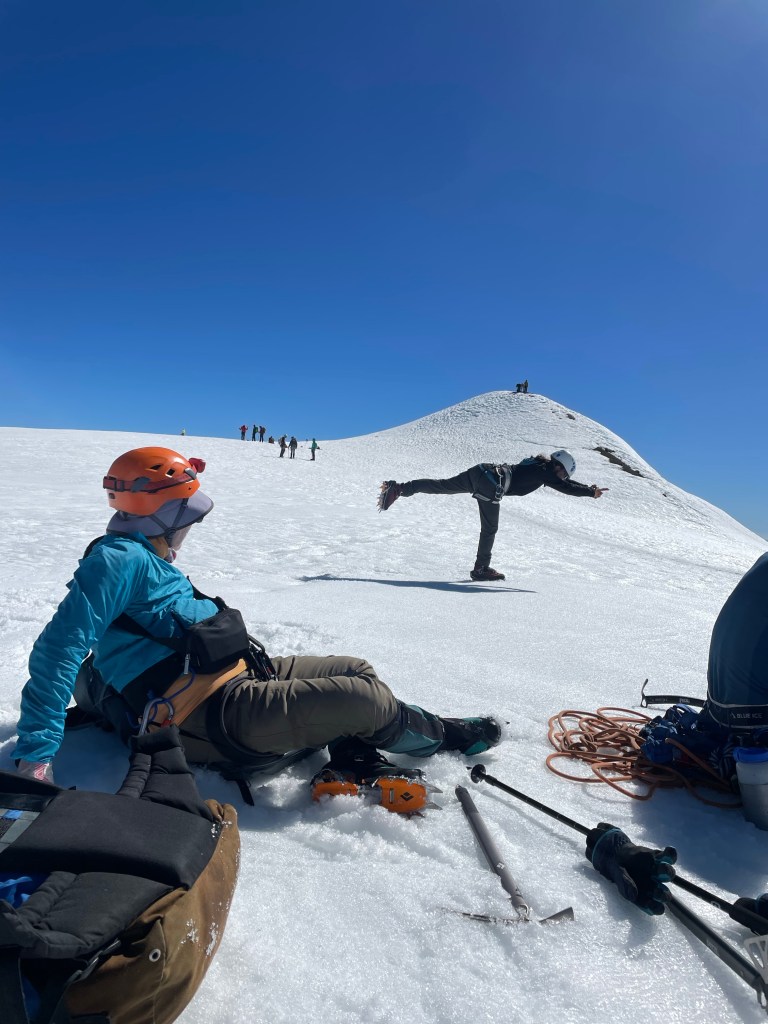 Crevasses presented a few adventures on the way down also. The glacier is always moving and the cracks in the snow were no longer where they were or the same width. In fact, although I didn’t see it, T reports to me that M had a “crevasse crash.” The snow at the edge of one deep crevasse had gotten slushier, and you needed to dig in your crampons before hopping across it to get traction. As M approached, she couldn’t get a good foothold, and, worried about breaking her leg if one foot slipped in, chose to dive headfirst across the crevasse with full momentum. According to T, she quickly uprighted herself, sat up, and started laughing.
