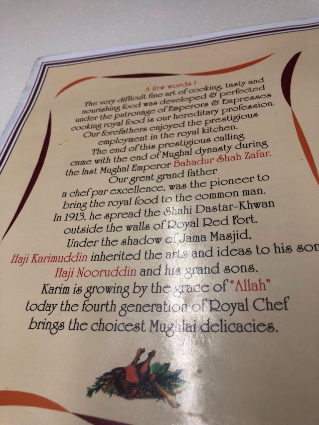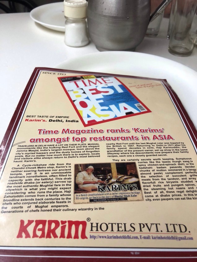 After several hours recreating the world of the sultans in our mind’s eye, we were ready to fortify ourselves with a 21st century lunch. I’d read about a Mogol restaurant that dated back to 1913 that was supposedly run by the descendants of a chef to the sultans. We tried to walk there from the Red Fort, through reams of people, beggars, salesmen, and just occupants of the city. We eventually figured out Google Maps was taking us in circles, and I was still dealing with a swollen and numb foot – so we swallowed our adventurers’ pride and hailed a motorized rickshaw type thing. I showed the driver the address on my phone, and along we went though narrow streets only to be dropped off at what appeared to be a literal hole in the wall, but turned out to be a warren of interconnected restaurants. Yes, it was a little Alice in Wonderland-like.