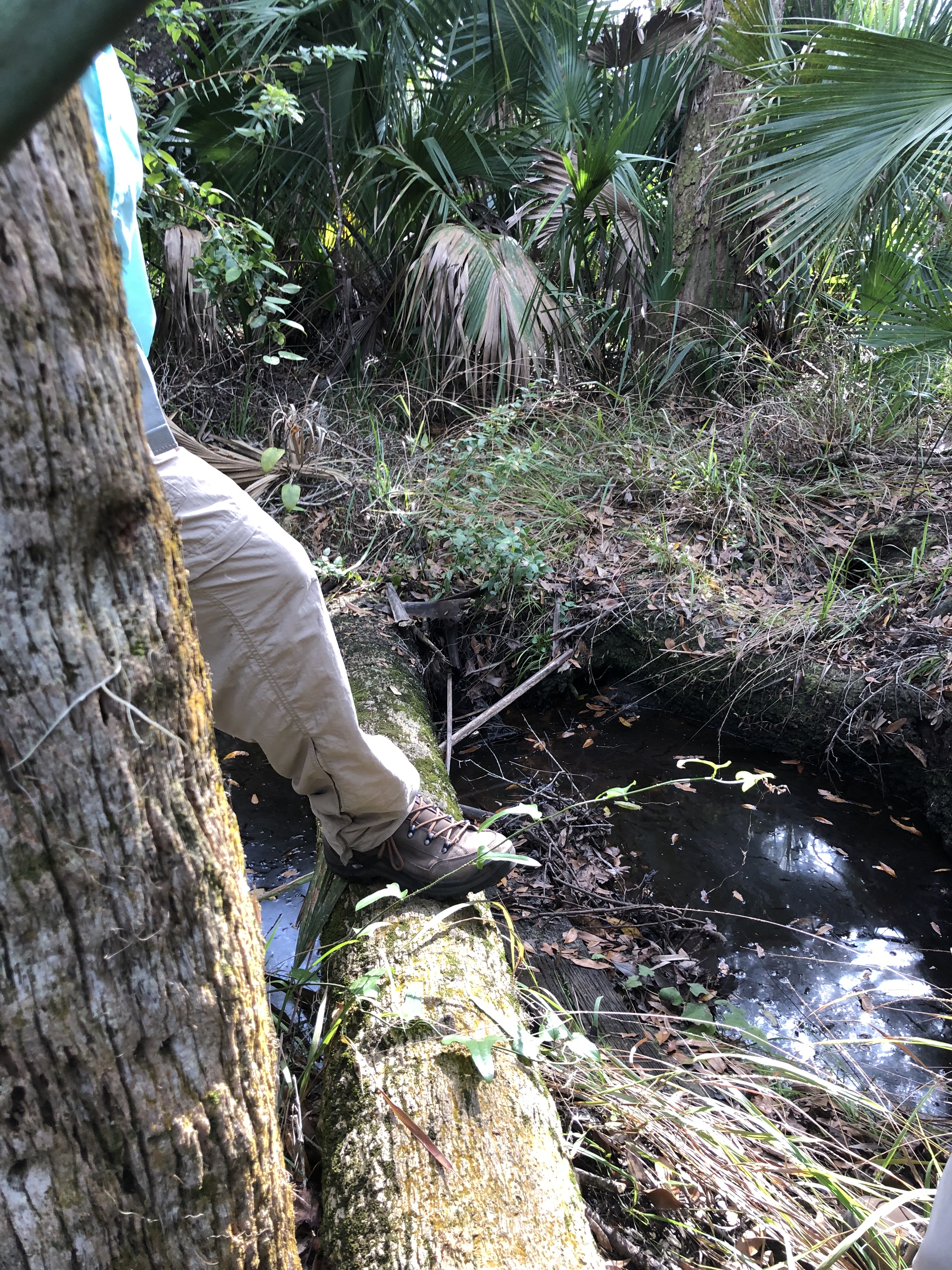 After a quick lunch, it was time to find the white blazes again. Once again we took off through the saw palmettos – but now what we thought was the trail took us into a heavily forested boggy area. The directions referred to a “dank and earthy smell emanating up from the earth.” That seemed consistent, right? This is the point where M realized she should have worn her high top hiking boots.