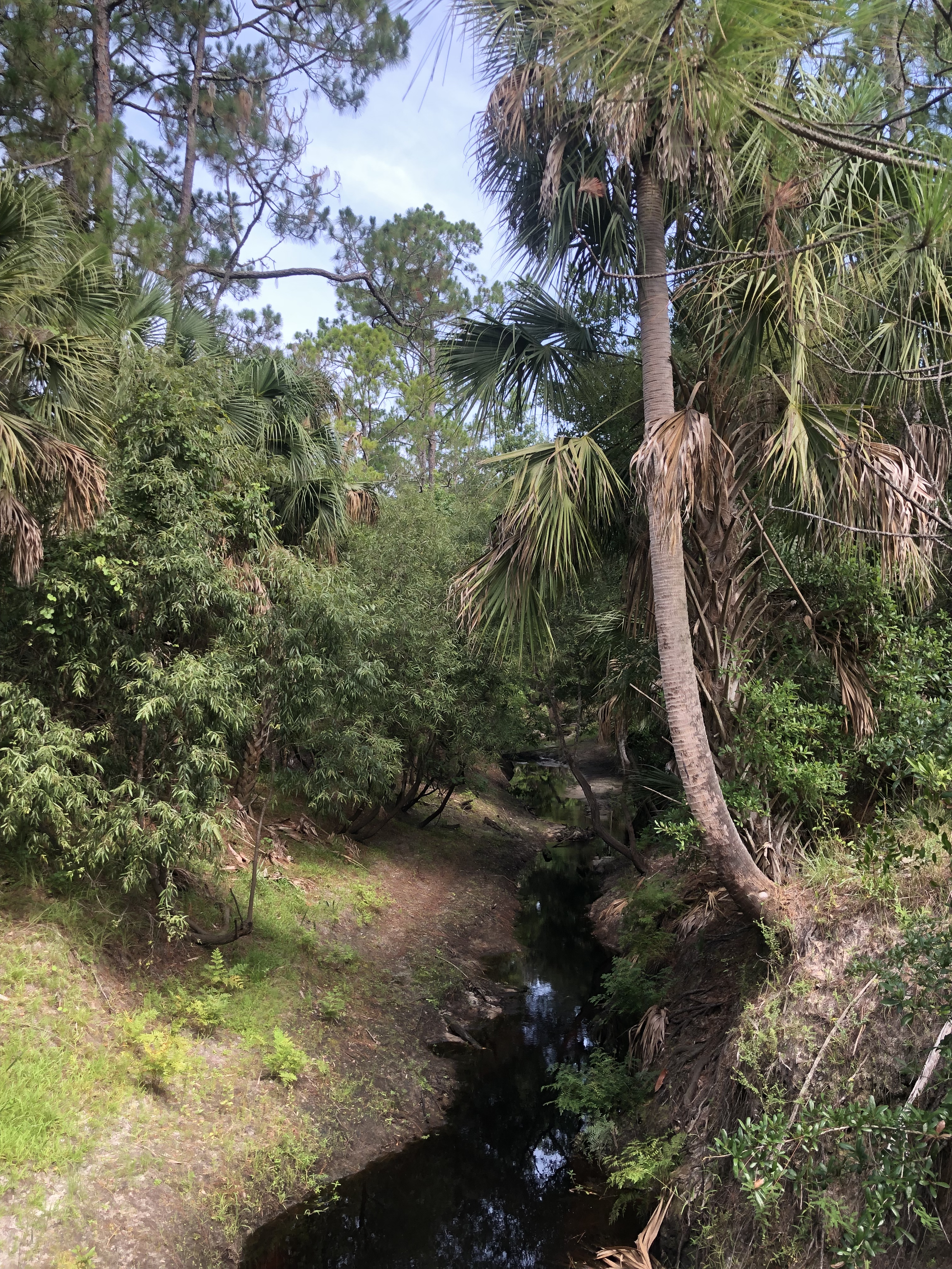 After fording a couple of streams and fighting with some very thick over and undergrowth we finally found what we believed to be some white blazes. But these led us back to a white sand road. We walked along it and then saw blazes on a tree way across another field of saw palmettos. But as the trail, according to the directions, was going to rejoin the sandy road we thought were on, we decided not to bother with that particular scenic overlook and to stay on the road for a bit. Turned out the road wasn’t any easier walking as you sank several inches into the sand with each step.
