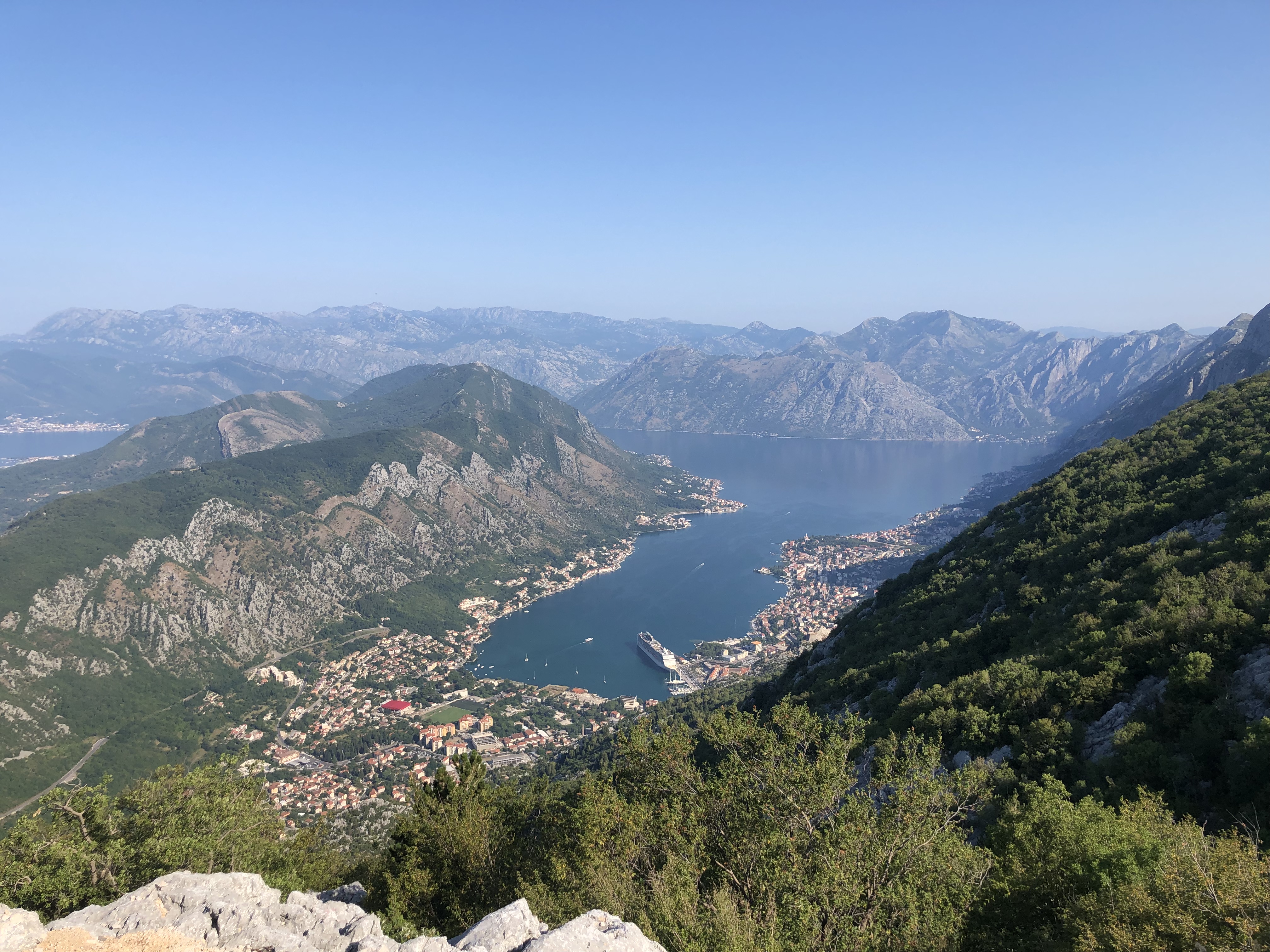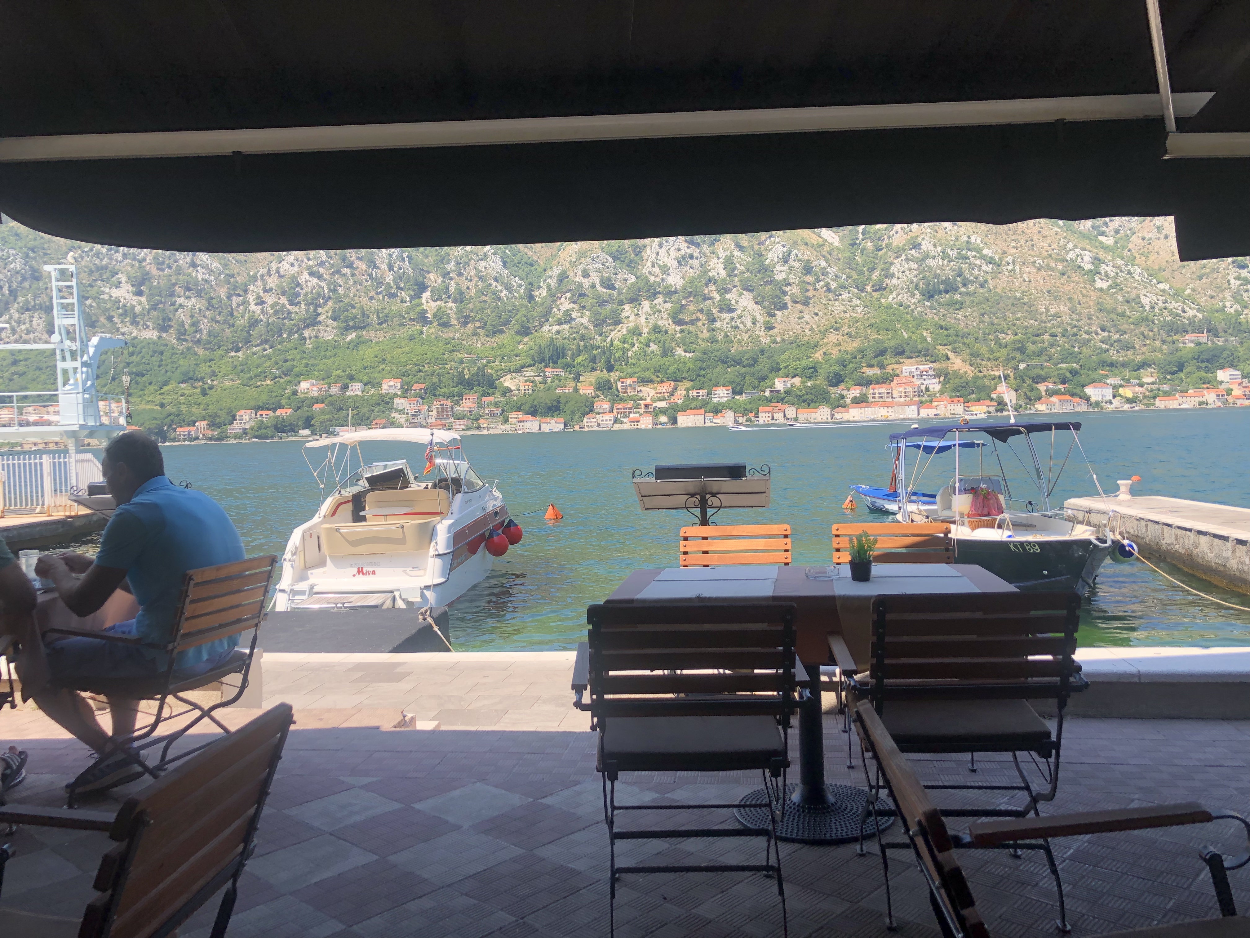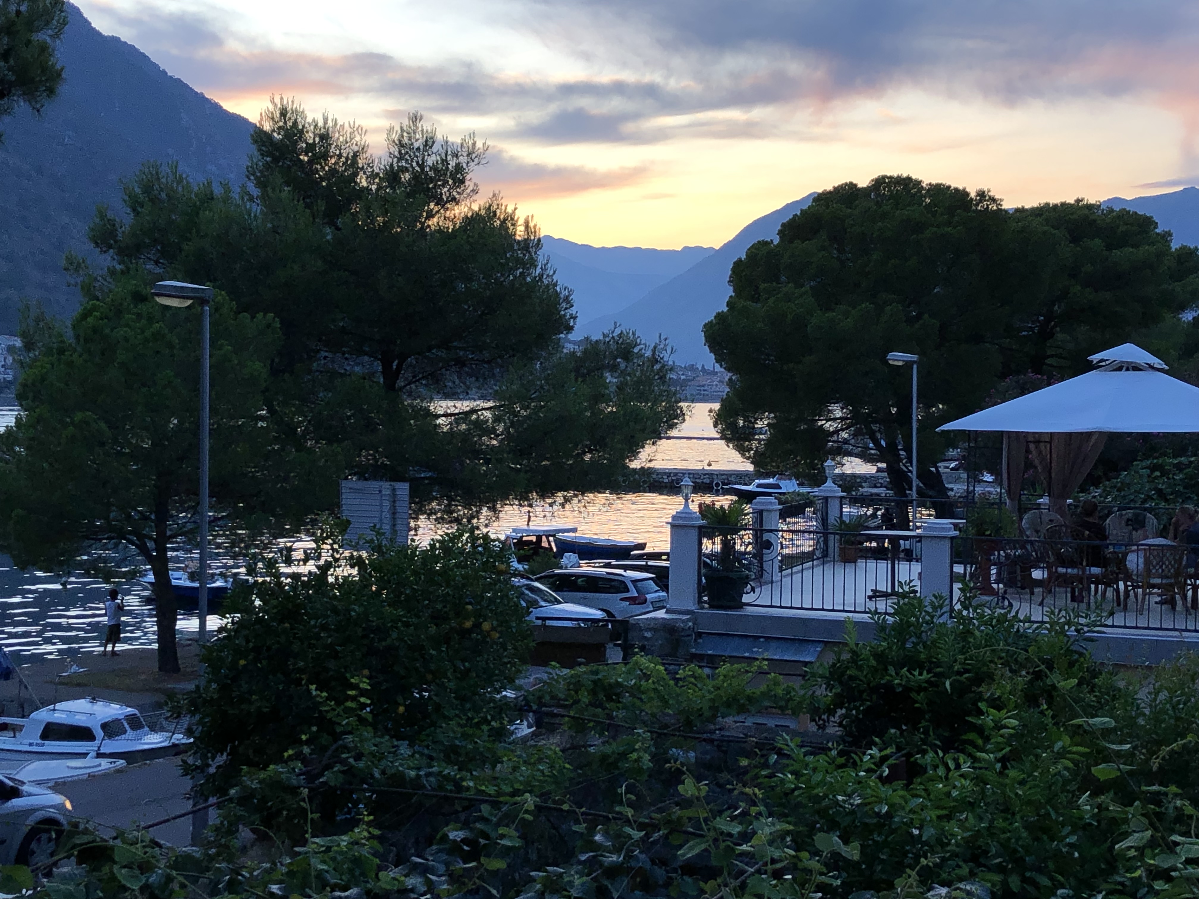 We started our next to the last day with a very beautiful and less terrifying drive to Kotor Bay. Kotor Bay, located in Montenegro, is filled with domestic tourists, all of whom were enjoying spectacular weather. We were also celebrating the end of the trek with much nicer accommodations – J and I even had a room with a balcony and a view of the bay. Prices went up accordingly. No more Pristina like lunches for 8 for $20 with drinks.